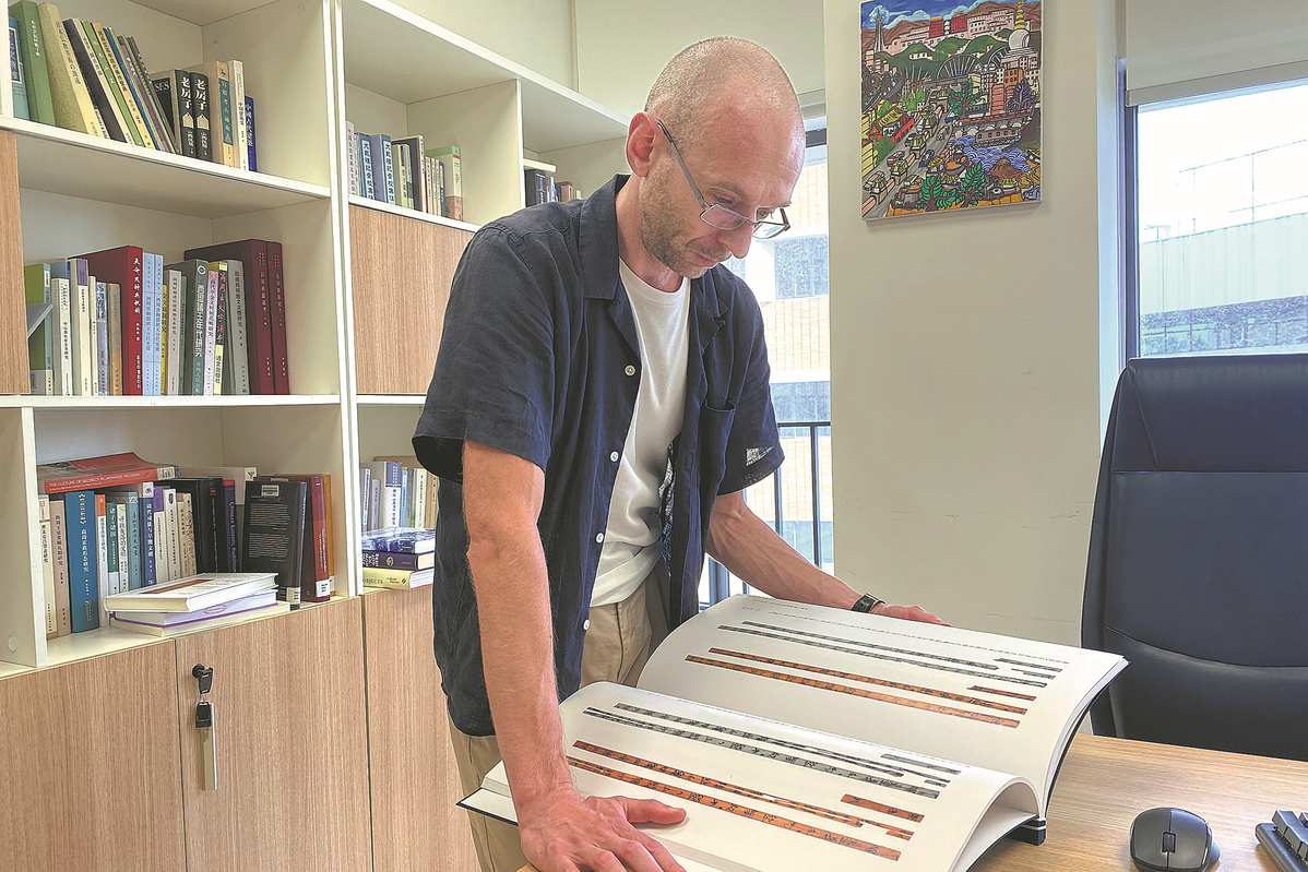 Yegor Grebnev reads a collection of bamboo slips in his office at the Beijing Normal University-Hong Kong Baptist University United International College in Zhuhai, Guangdong province. [Photo provided to China Daily]