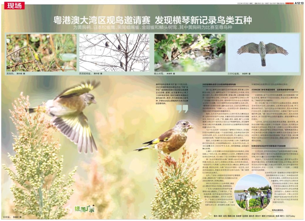 据悉,28支参赛队伍记录总鸟种数118种。为横琴录得新记录鸟类5种,分别是黄胸鹀(国家一级保护野生鸟类)、日本松雀鹰(国家二级保护野生鸟类)、黑尾蜡嘴雀、金翅雀和鳞头树莺。