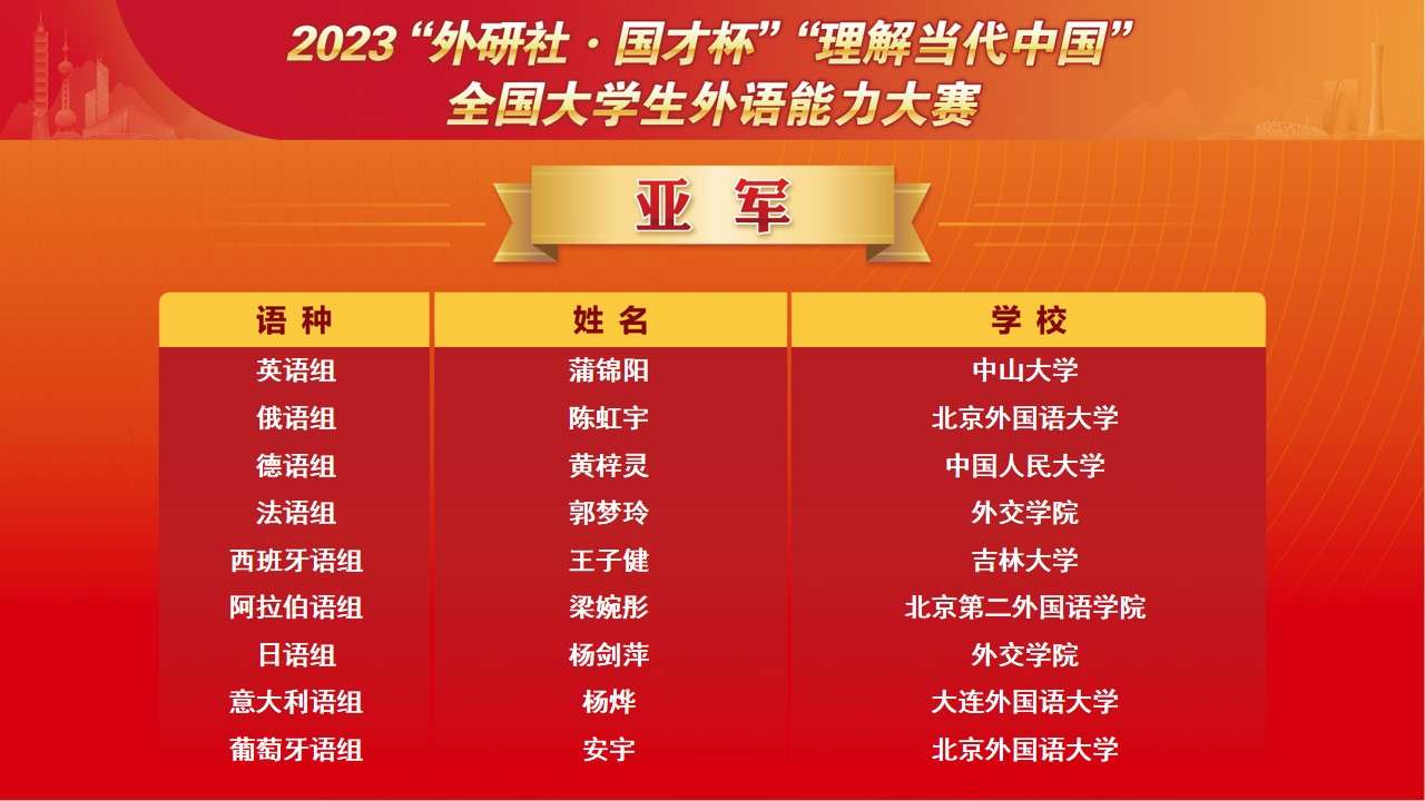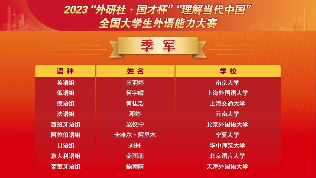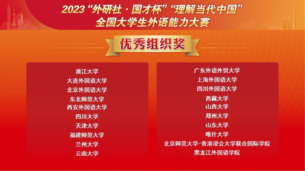 12月8日,2023“外研社·国才杯”“理解当代中国”全国大学生外语能力大赛国赛落幕。比赛以“理解中国,沟通世界”为主题,分为英语组和多语种组两大组别,历经校赛、省赛、国赛三个赛段,来自1300多所院校的近百万学生参赛。大赛由北京外国语大学主办、外语教学与研究出版社承办。