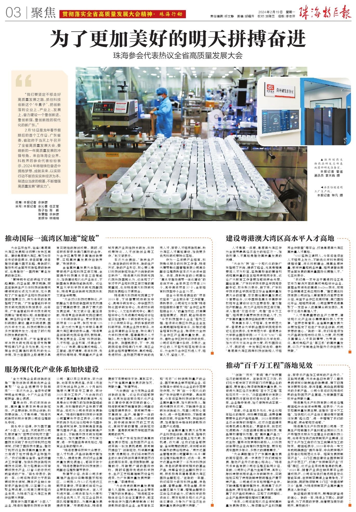 2月18日是龙年春节假期后的首个工作日,广东省委、省政府于当天上午召开了全省高质量发展大会,奏响新的一年高质量发展的冲锋号角。来自珠海企业界、科教界的参会代表纷纷表示,2024年将继续在奋进中拥抱梦想、成就未来,以实际行动不断夯实实体经济为本、制造业当家的根基,不断增强高质量发展“硬实力”。