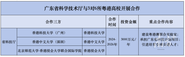 根据工作计划,2024年至2026年期间,省科技厅、香港高校及对应的合作办学高校将以“1+1+1”联合资助形式,三方每年各投入1000万元。也就是说,每对粤港姐妹高校每年将共同拥有3000万元经费,形成种子资金池。