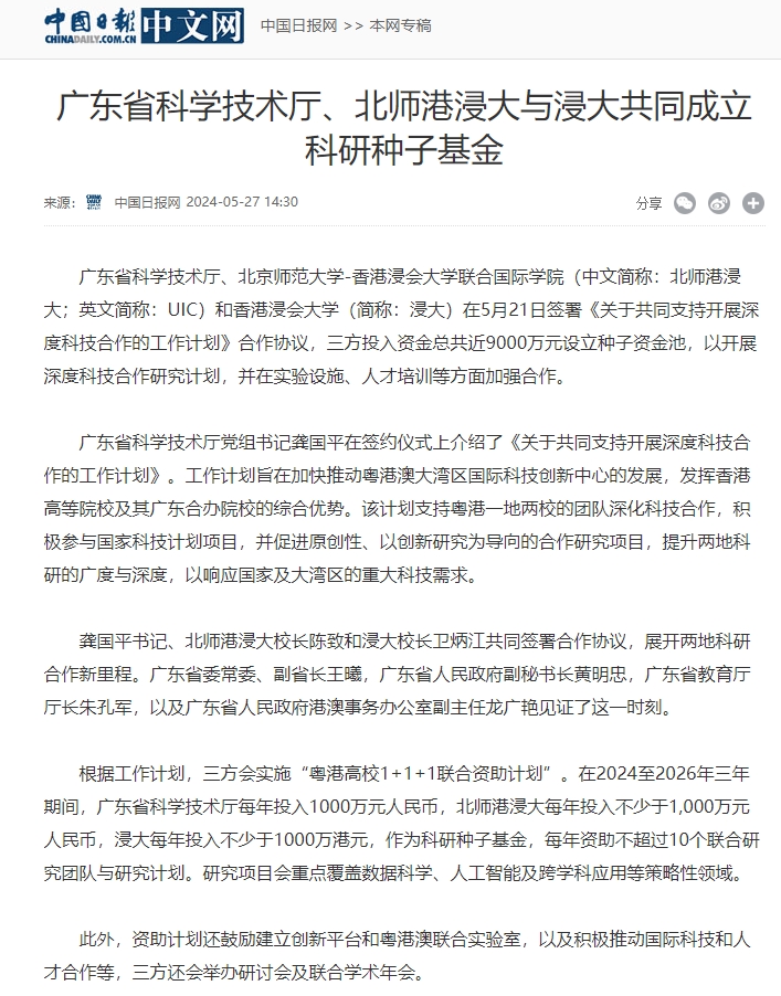 广东省科学技术厅、北京师范大学-香港浸会大学联合国际学院(中文简称:北师港浸大;英文简称:UIC)和香港浸会大学(简称:浸大)在5月21日签署《关于共同支持开展深度科技合作的工作计划》合作协议,三方投入资金总共近9000万元设立种子资金池,以开展深度科技合作研究计划,并在实验设施、人才培训等方面加强合作。
