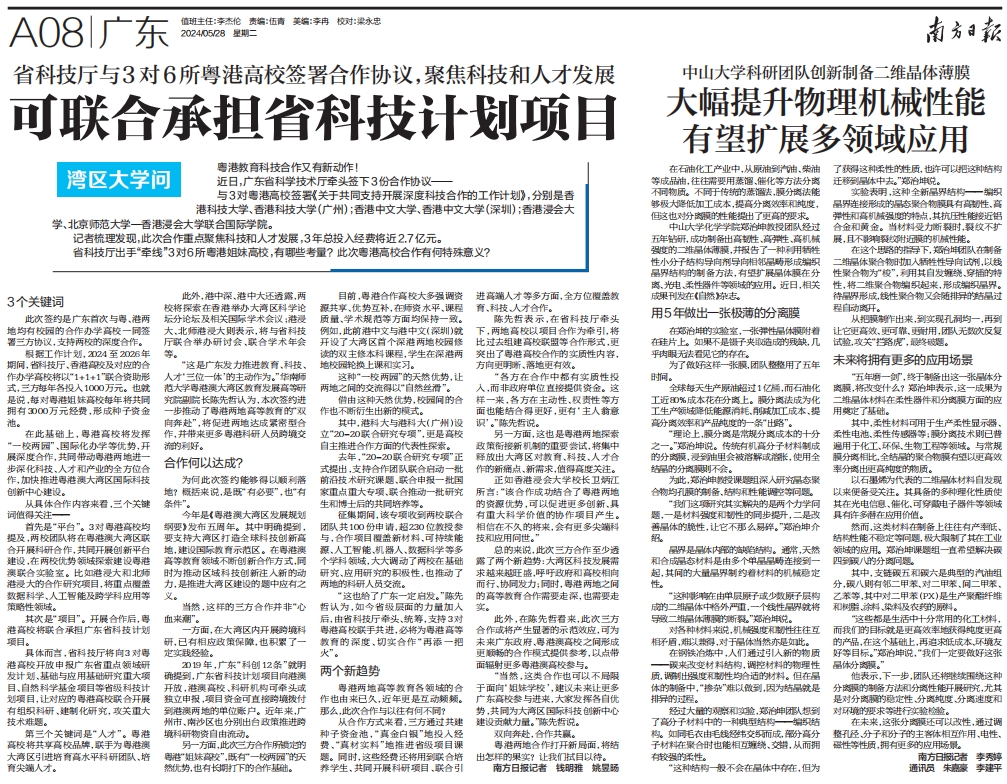 “这也给了广东一定启发。”陈先哲认为,如今省级层面的力量加入后,由省科技厅牵头、统筹,支持3对粤港高校联手共进,必将为粤港高等教育的深度、切实合作“再添一把火”。