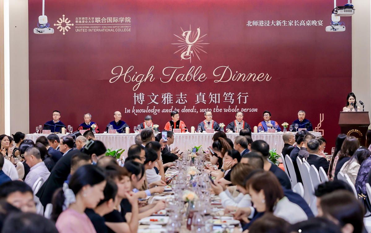 8月21日晚,北师港浸大举行2024级新生家长高桌晚宴,校长、教授与家长们齐聚一堂。宴前,北师港浸大校长陈致教授发表《校长第一课:推开大学之门》演讲,为家长们介绍了北师港浸大独特的博雅教育理念。