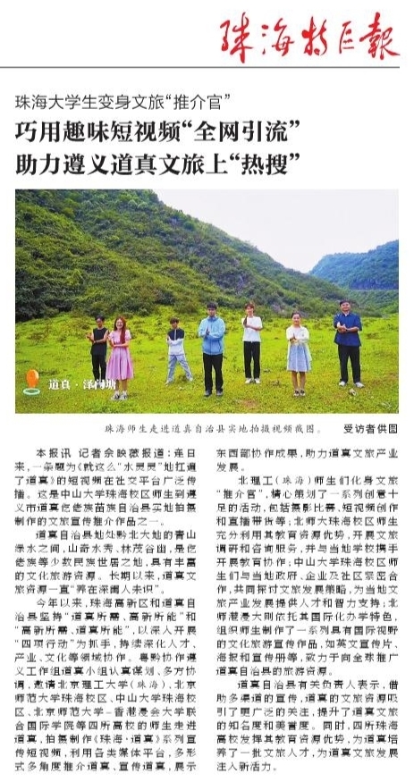 本报讯 记者佘映薇报道:连日来,一条题为《就这么“水灵灵”地扛遍了道真》的短视频在社交平台广泛传播。这是中山大学珠海校区师生到遵义市道真仡佬族苗族自治县实地拍摄制作的文旅宣传推介作品之一。