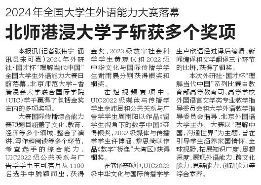 本报讯(记者张伟宁 通讯员宋可嘉)2024年外研社·国才杯“理解当代中国”全国大学生外语能力大赛日前落幕,北京师范大学-香港浸会大学联合国际学院(UIC)学子赢得了包括金奖在内的多项奖项。
