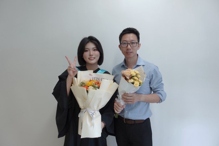 丁子怡与传播系副系主任许夏营(上)、公共关系与广告学专业副教授Chally Lim(下)合影