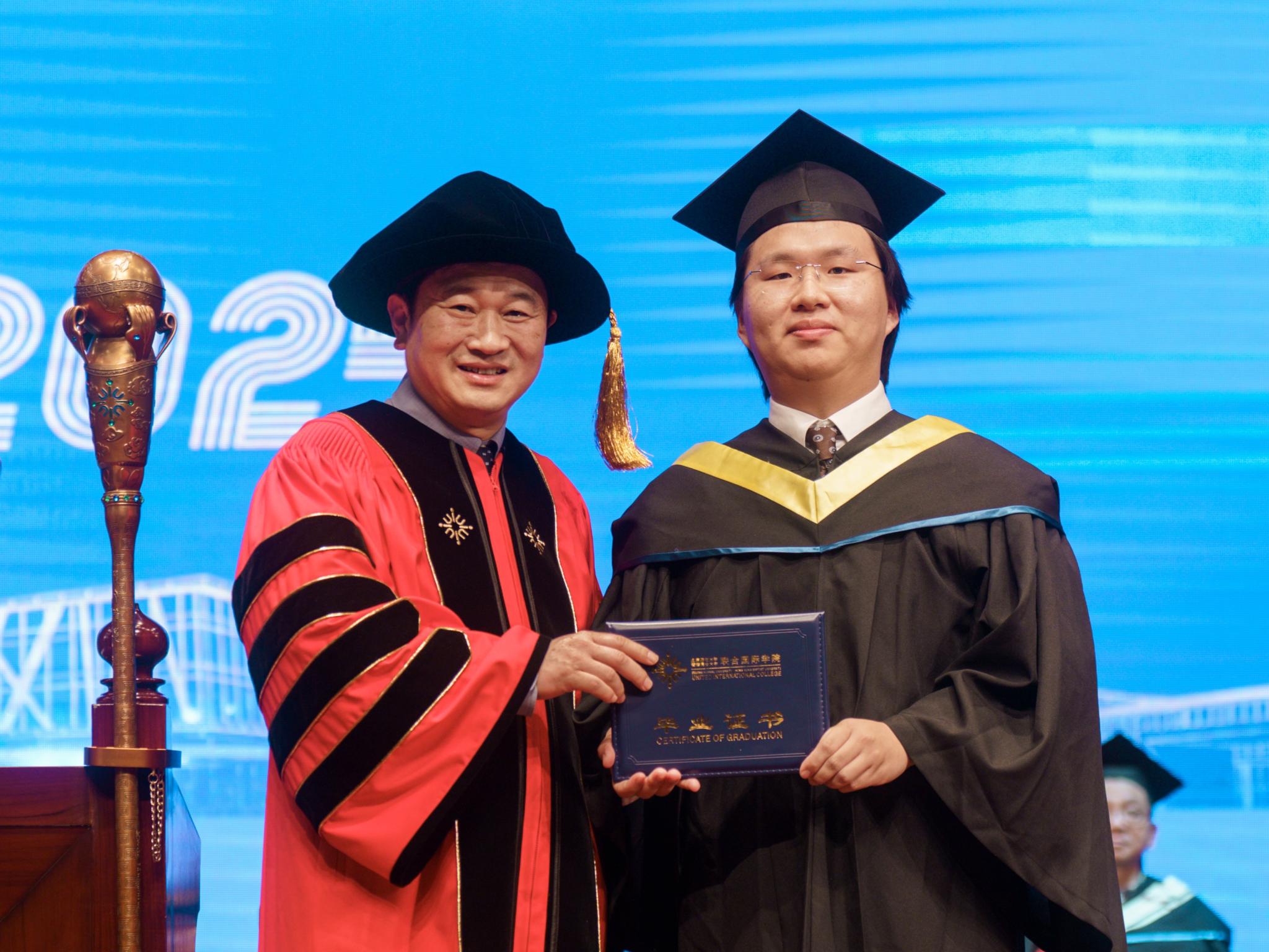 杨佳宁在毕业典礼上与北师港浸大校长陈致教授合影