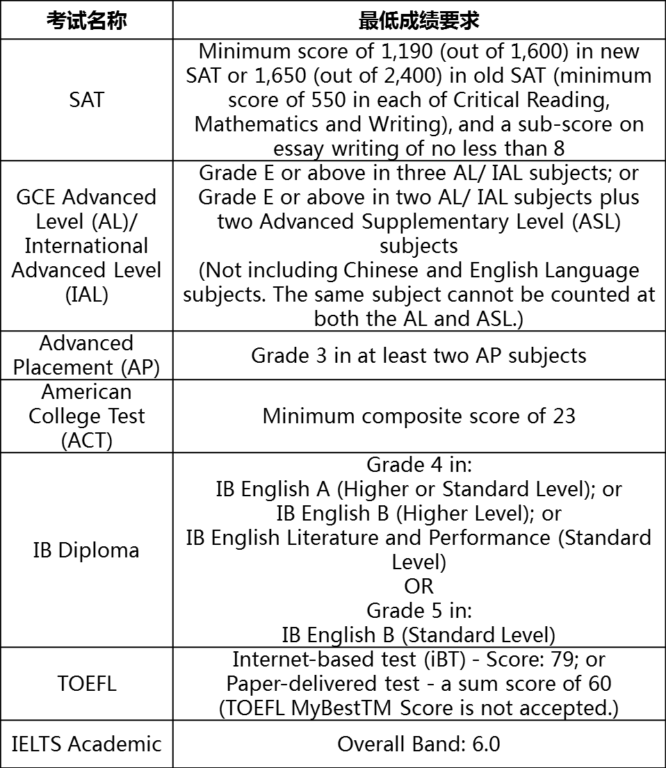 *注:学校对考生的SAT /GCE A-Level / AP/ACT/IB等公开考试成绩要求,及雅思、托福或其他外语考试成绩要求,将参照香港浸会大学相关入学要求: