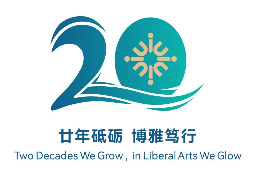 校庆标识以数字“20”为核心元素,描绘建校20周年的重要里程碑;“波浪”元素则体现学校所处粤港澳大湾区的地理位置,亦象征永立潮头、不断进取的精神。标识下方嵌入校庆中英文主题“廿年砥砺 博雅笃行(Two Decades We Grow, in Liberal Arts We Glow)”。