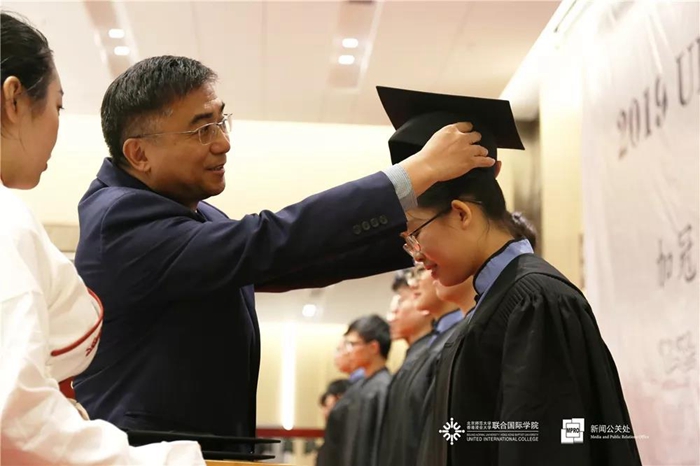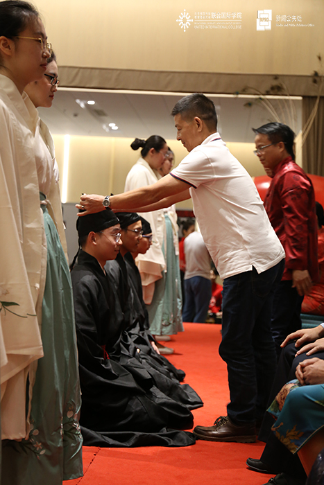 三拜三加,拜主宾。参礼学生着学士服。主宾珠海市文化体育旅游局副局长邬向明先生,中国科学院院士、北师港浸大校长汤涛教授分别为学生戴学士帽,学生鞠躬致谢。