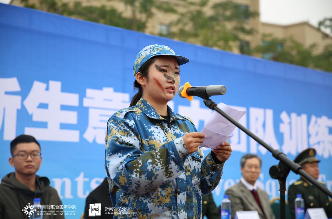 24连连长、统计学专业的郭思齐作为学生代表发言。她表示,五天的训练过后,“战友们”都对军事演练有了不一样的理解,大家一天比一天认真,那把枪也因此变得更加有份量,因为那上面是满满的责任,对自己、对队友、对团队的责任。她说:“意志力训练使我们从懒散变团结,这里不光有我们的坚持,还有教官们的一遍遍督促。是教官让我们了解到更多关于军事演练的知识,更让我们体会到中国军人的纪律与责任。”