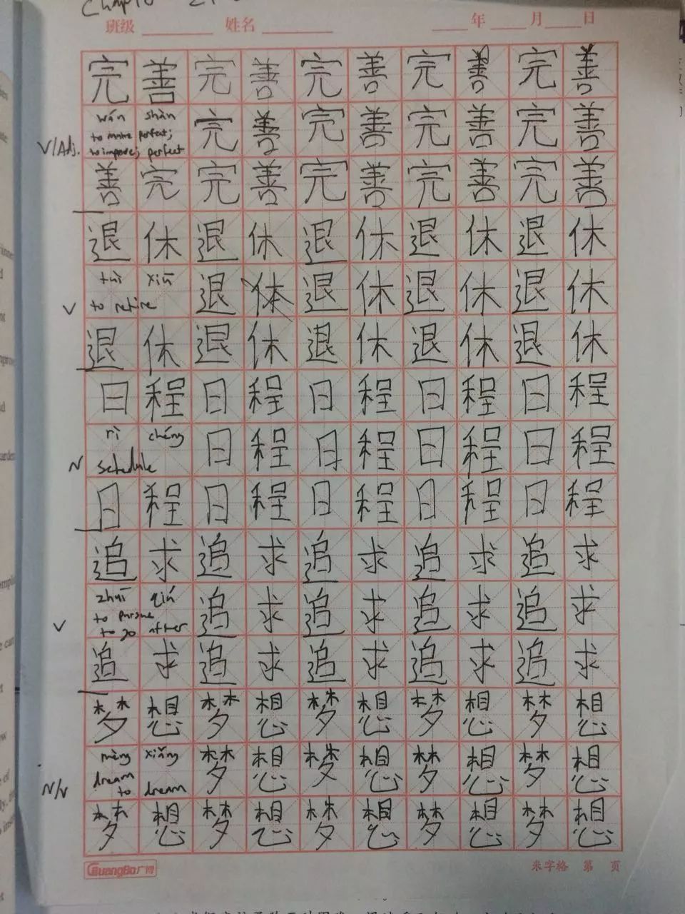 除了上汉语课,欧阳乐士也会做练习题,认认真真地用田字格抄写汉字。“我一周大概花10-15小时来复习、学习或练习汉语(不包括日常与中国人的对话),但我感觉这真的不够。学习汉语是一个很费时间的过程,因此我建议有兴趣学习的人应保证每天有大量的时间可以学习,并使之成为一个日常习惯。你要有所计划,把这些习惯坚持3到5年,这样才会真正有效果。”