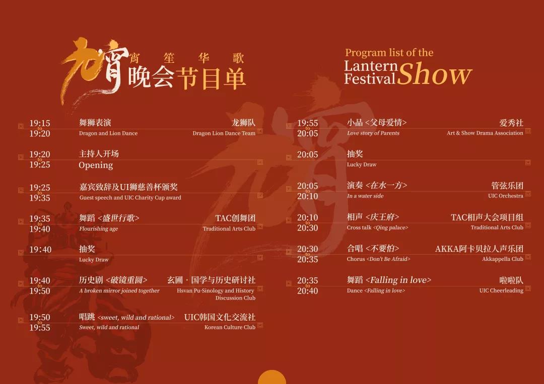 19点15分,元宵晚会将在大学会堂上演,节目单先睹为快!UICer用才艺点亮的多彩夜晚。花好、月圆,在UIC,这个元宵节爱意满满、暖意浓浓。
