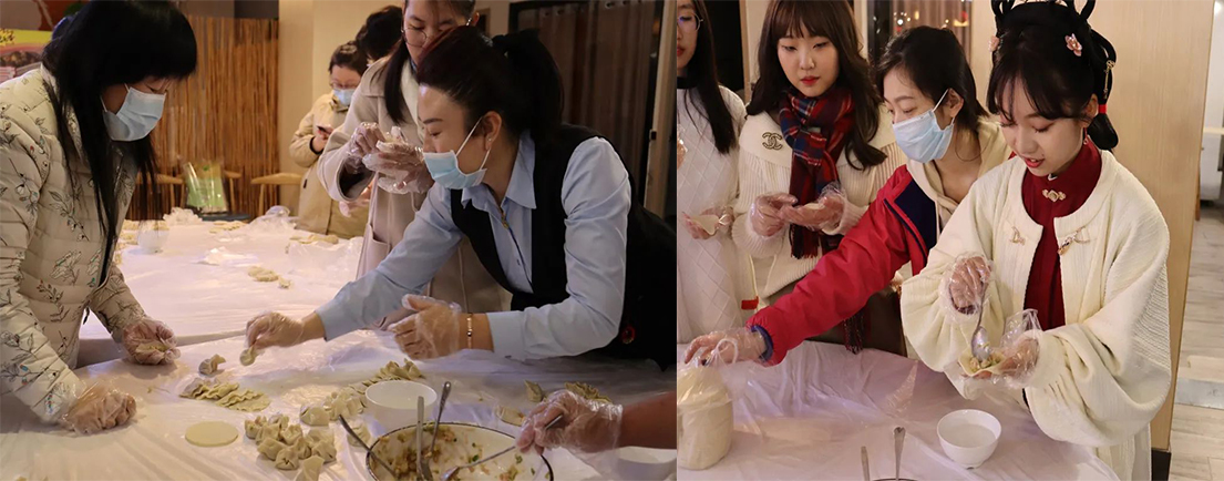 除夕下午,影视专业课程主任万多明博士,工商管理学部助理教授、博雅苑舍监马杰芳博士也来到食堂和同学们一起包饺子。