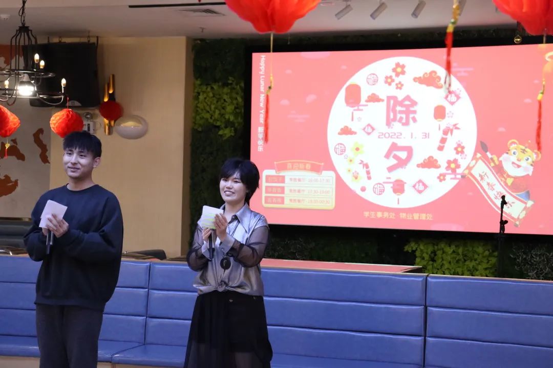 席间,师生开心畅聊,有同学自发表演助兴,还有抽奖活动,欢乐不断。吃过年夜饭,同学们一起看春晚,玩小游戏,其乐融融。