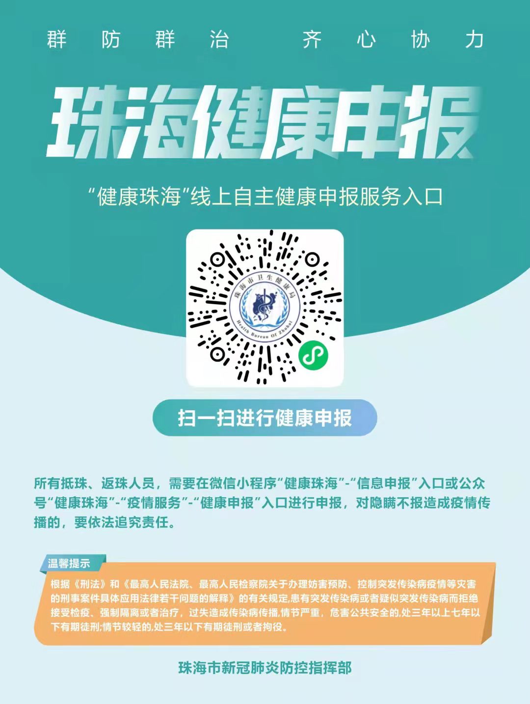 目前疫情防控正处于关键时期。从4月2日零时起,所有抵珠、返珠人员(包括3月17日以来有外地旅居史人员)须直接扫描“珠海健康申报”二维码进行申报,对隐瞒不报造成疫情传播的,要依法追究责任。