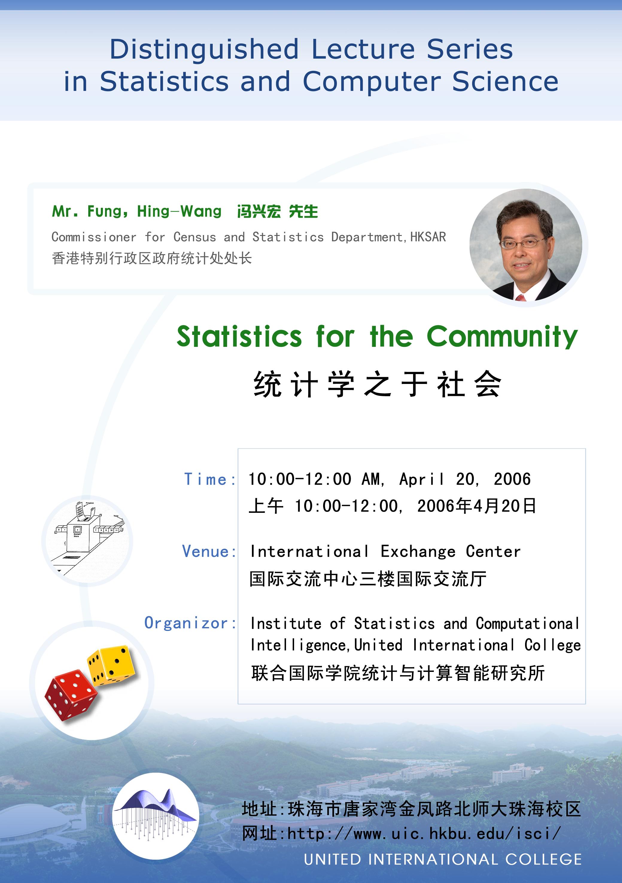 - The first Lecture - Statistics for the Community, by Mr. Fung, Hing Wang, Commissioner for Census and Statistics Department, HKSAR. [海报] [演讲稿] [照片]