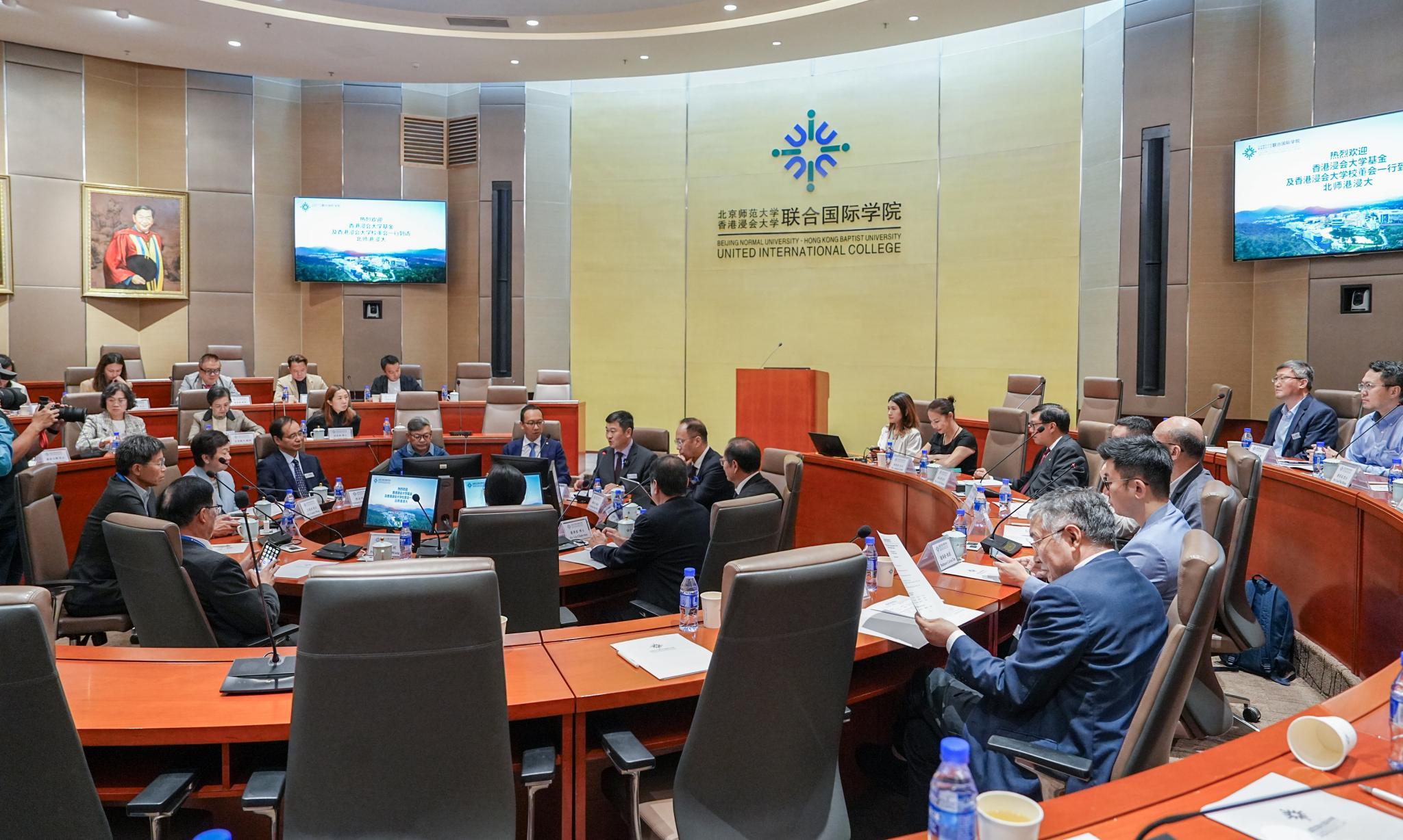A welcoming meeting was held, where UIC President Prof Chen Zhi introduced the university's development history and recent achievements, expressing optimism for increased cooperation with HKBU.