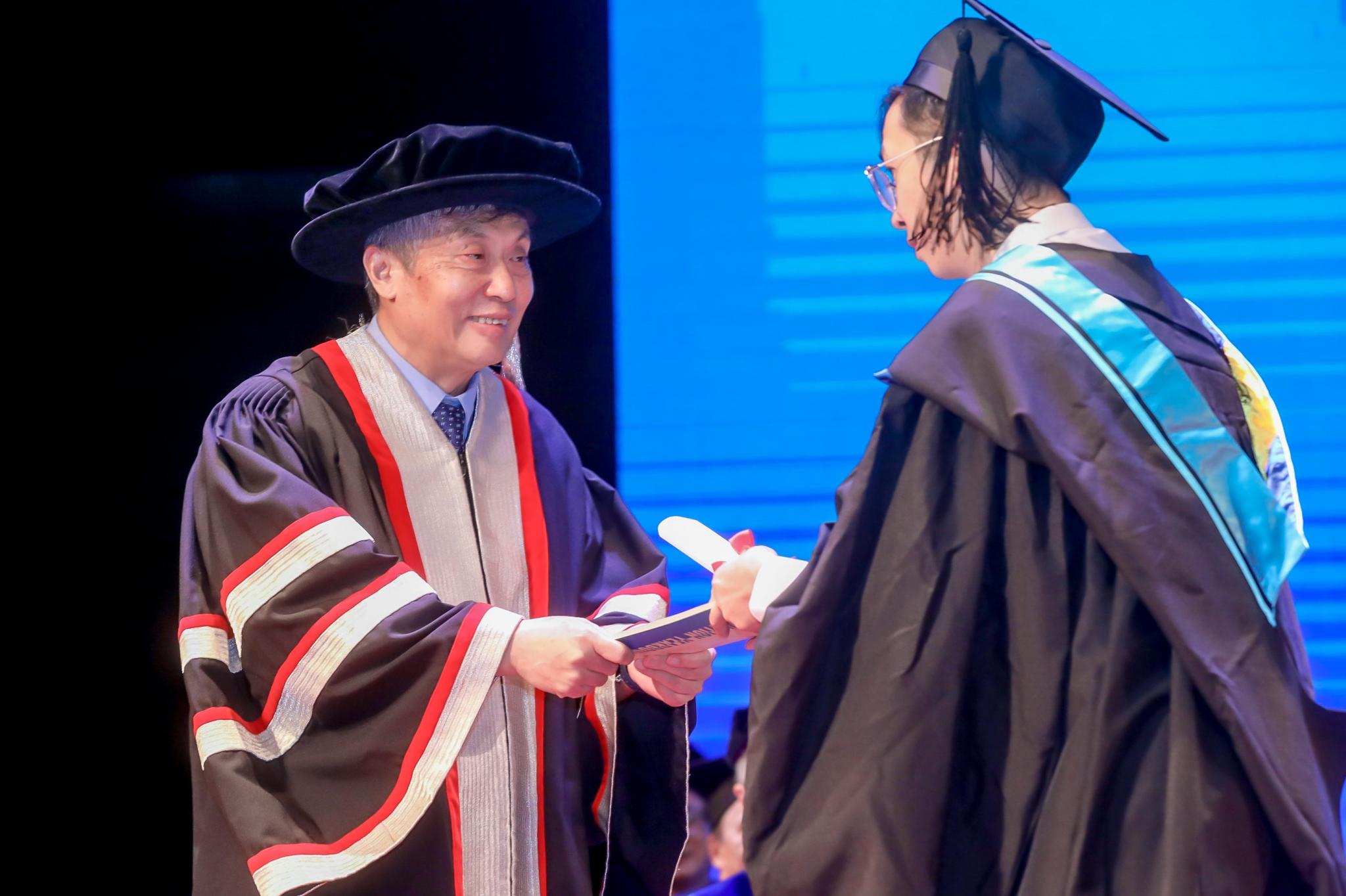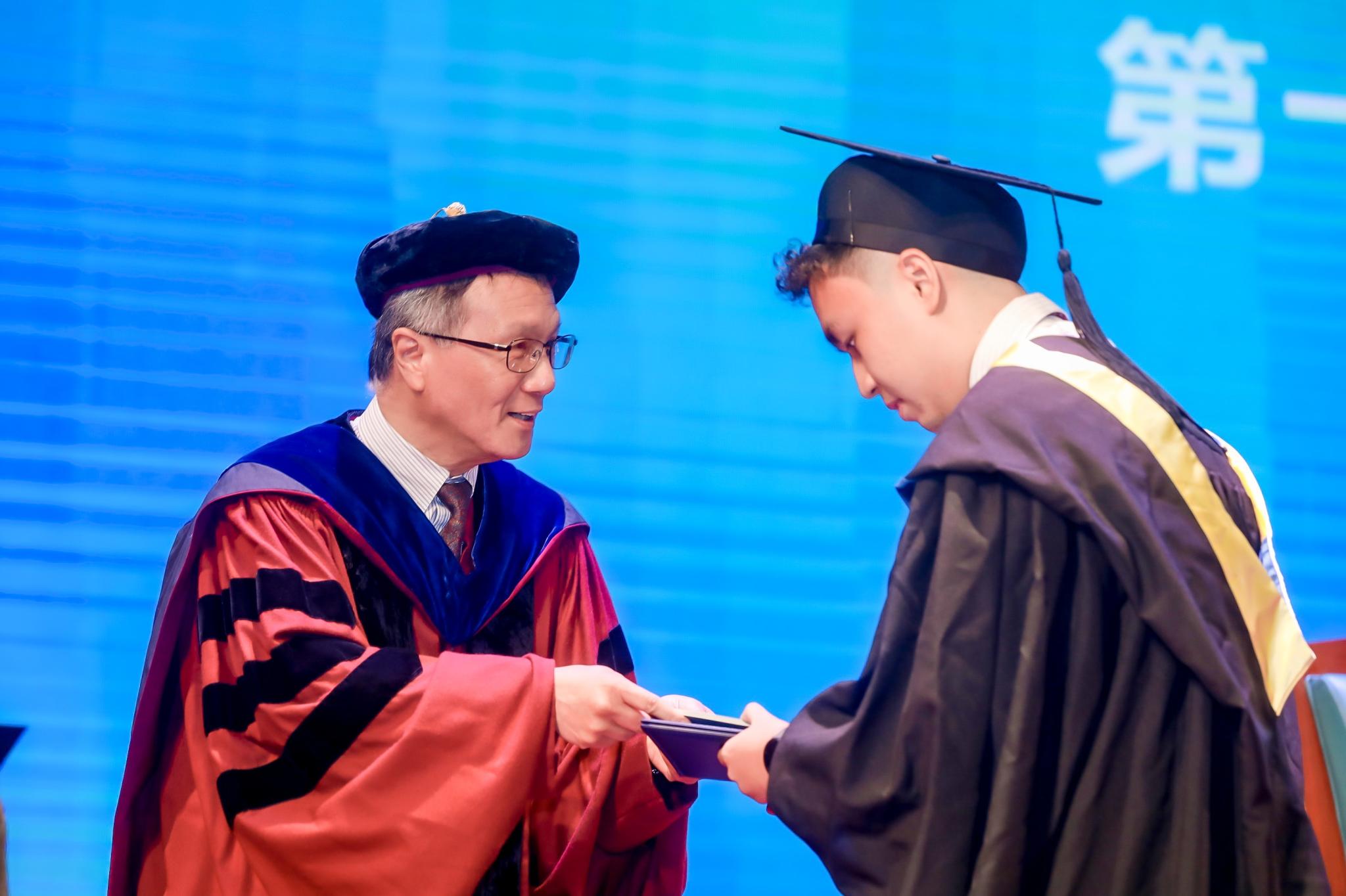 Prof Zhou Yongming presents a certificate of graduation to a UIC graduate