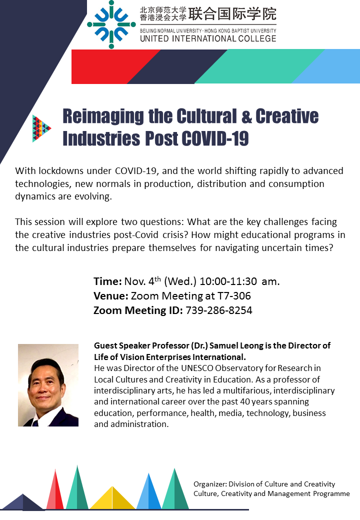 We sincerely invite you to attend a guest speaker lecture entitled Reimaging the Cultural & Creative Industries Post COVID-19 that is organized by Culture, Creativity and Management Programme.