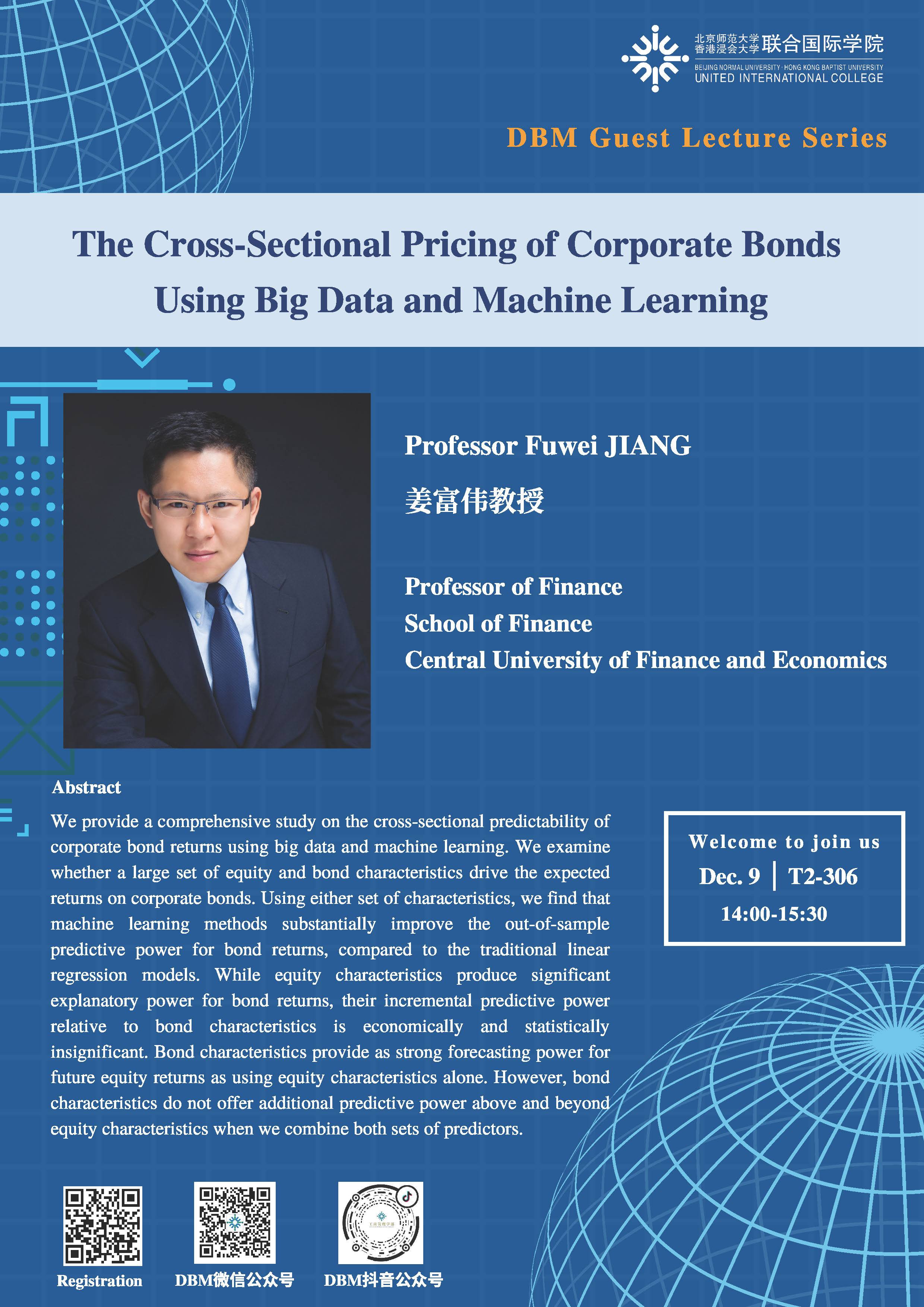 Dr. Jiang received a Master and a Ph.D. in Finance from Lee Kong Chian School of Business, Singapore Management University. His main research interests are asset pricing, return predictability, investment, behavioral finance and entrepreneurial finance. Also, he teaches Empirical Methods in Finance and Financial Markets and Institutions for CUFE undergraduate, MSc. and Ph.D. Furthermore, his papers have appeared in Journal of Financial Economics、Review of Financial Studies, and other finance journals.