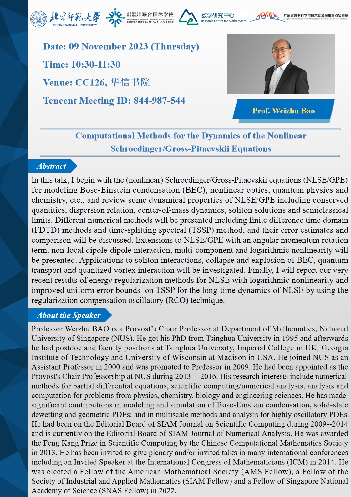 Speaker: Prof. Weizhu Bao, National University of Singapore