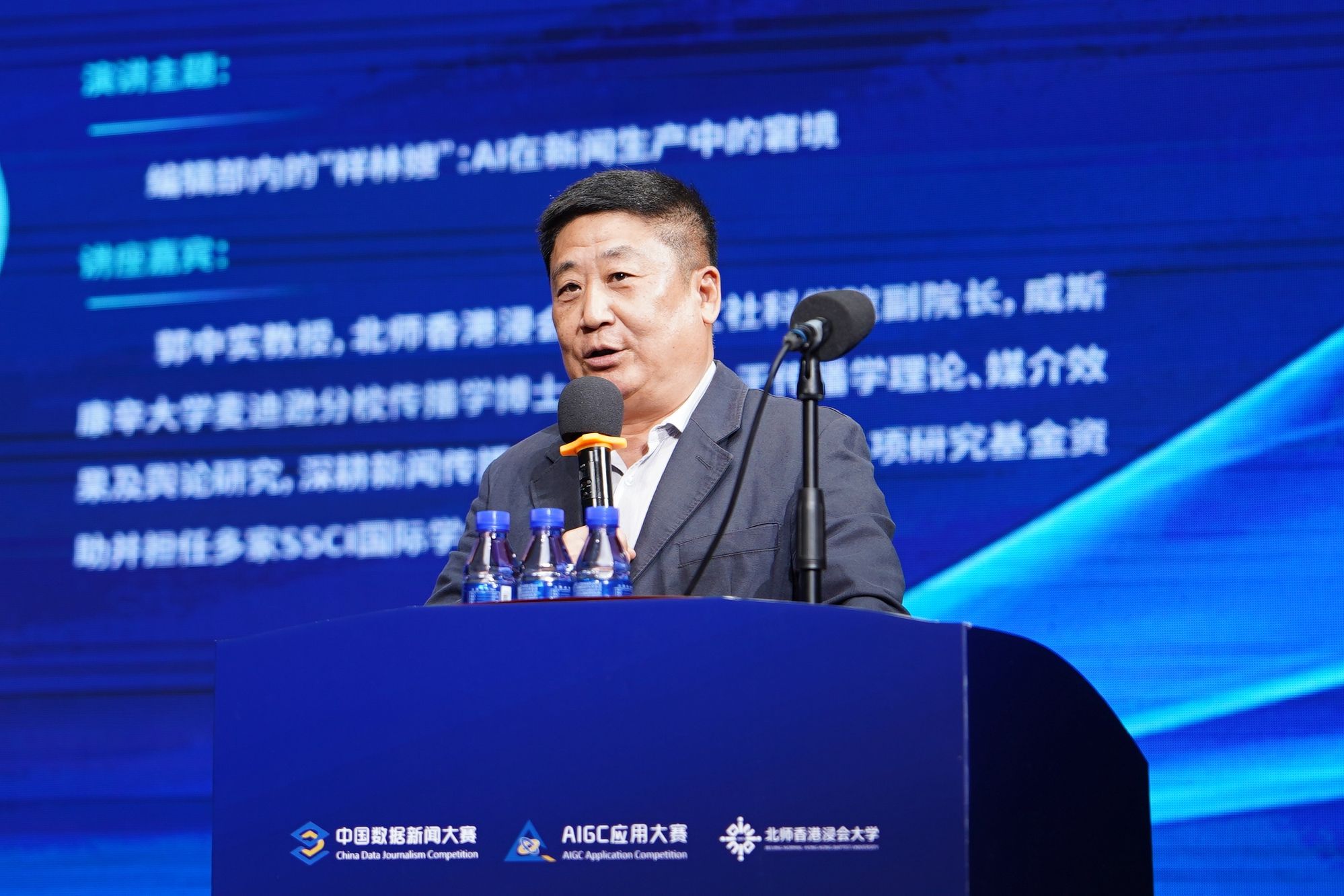北师港浸大郭中实教授则带来《编辑部内的“祥林嫂”:AI在新闻生产中的窘境》主题演讲。他犀利指出当前AI在新闻编辑部犹如“祥林嫂”,有些事情它不能做。郭中实教授强调:AI是个好助手,但在新闻报道中,涉及意识形态判断、深度分析及价值导向时,AI有着难以避免的盲点、误区和死穴。他以“成也萧何,败也萧何”总结AI依赖风险,并提醒业界,AI终究没有立场与情感,唯有保持审慎,方能为我所用而不为其所困。