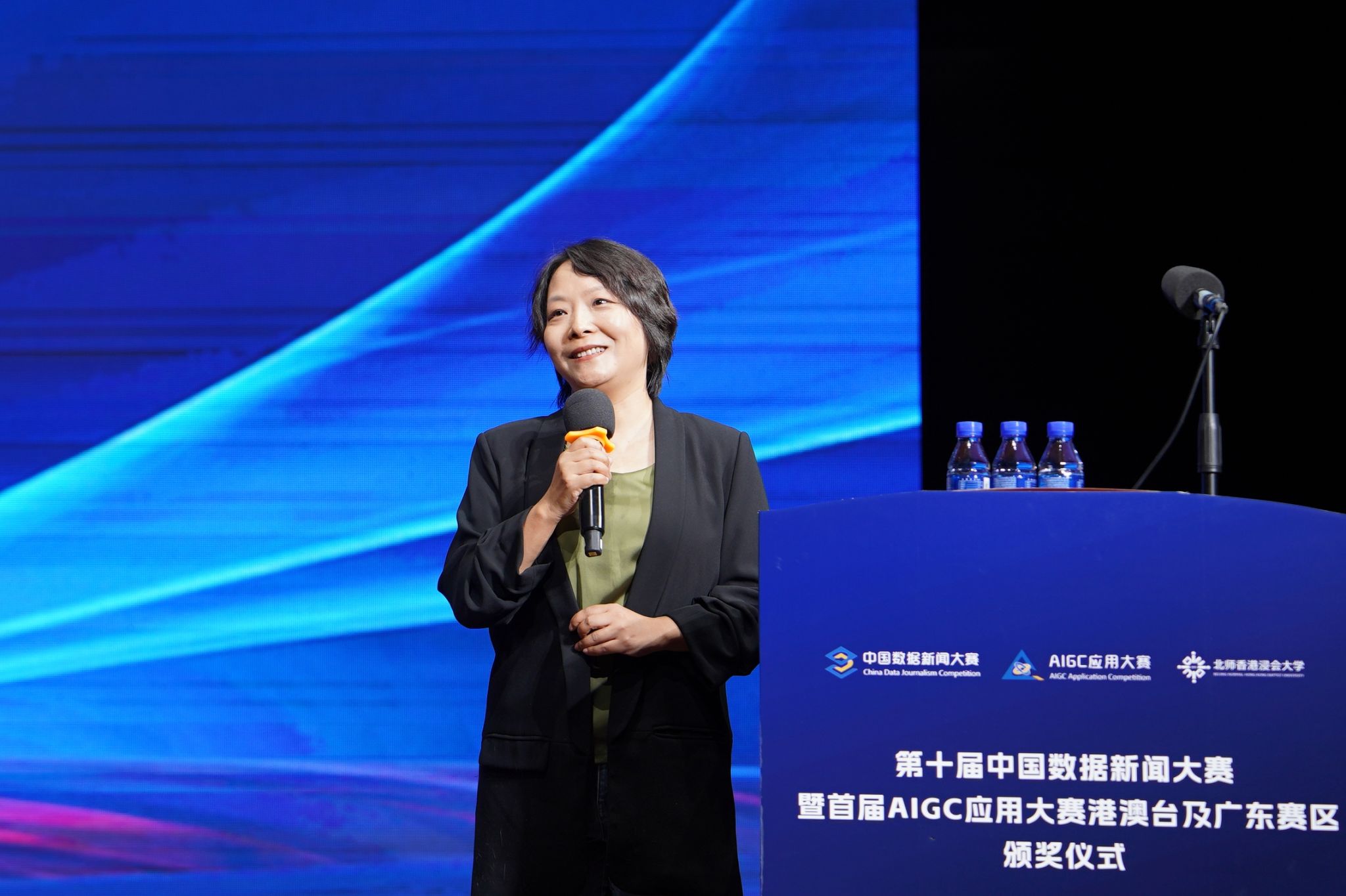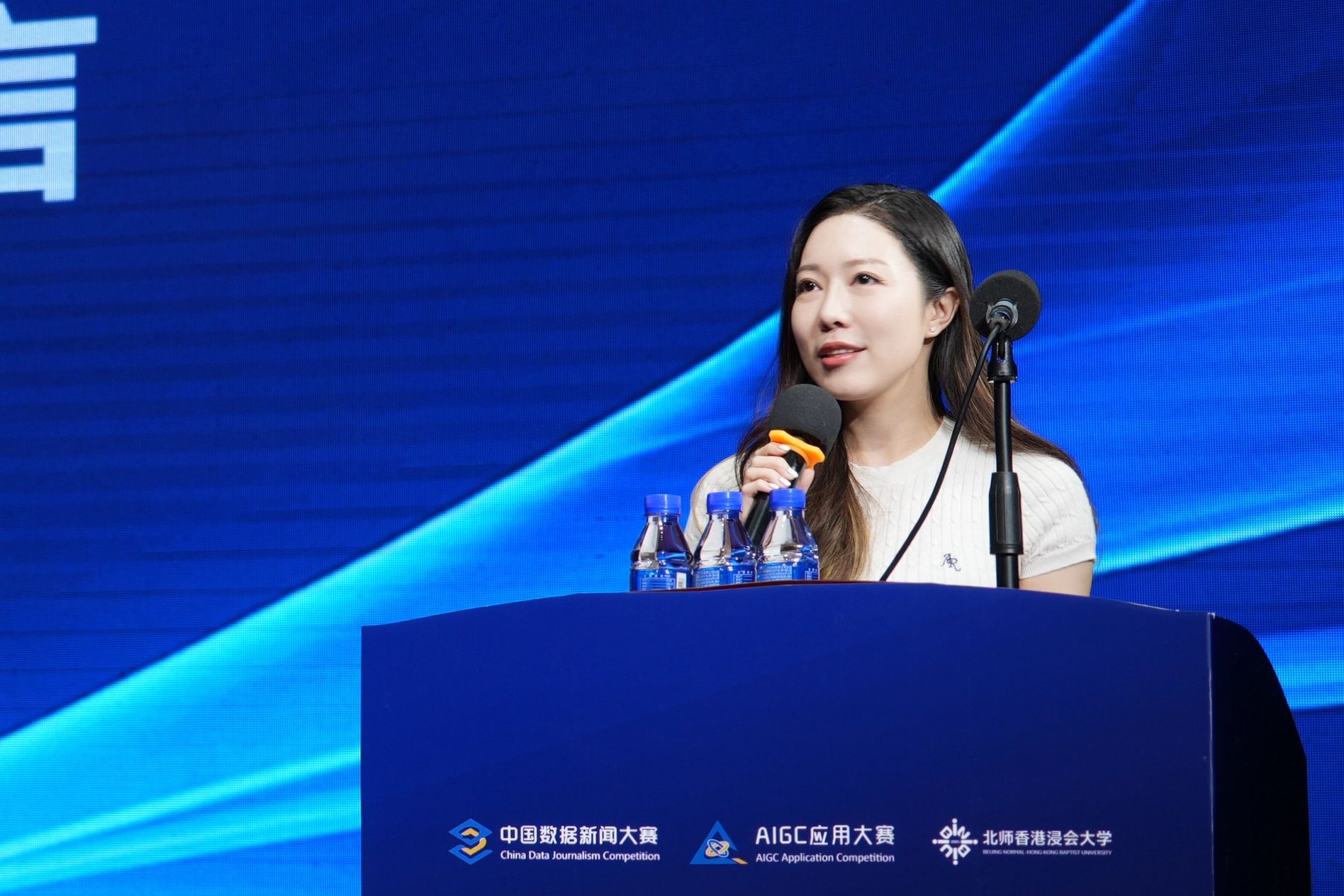香港浸会大学数码媒体与传播课程主任王悦博士作为获奖作品指导教师代表上台发言,她表示,大赛是课堂延伸的实践舞台,在AI重塑内容的浪潮中,广大参赛者是引领变化的中坚力量,无论获奖与否,完成数据新闻多维能力的淬炼即是成长勋章。