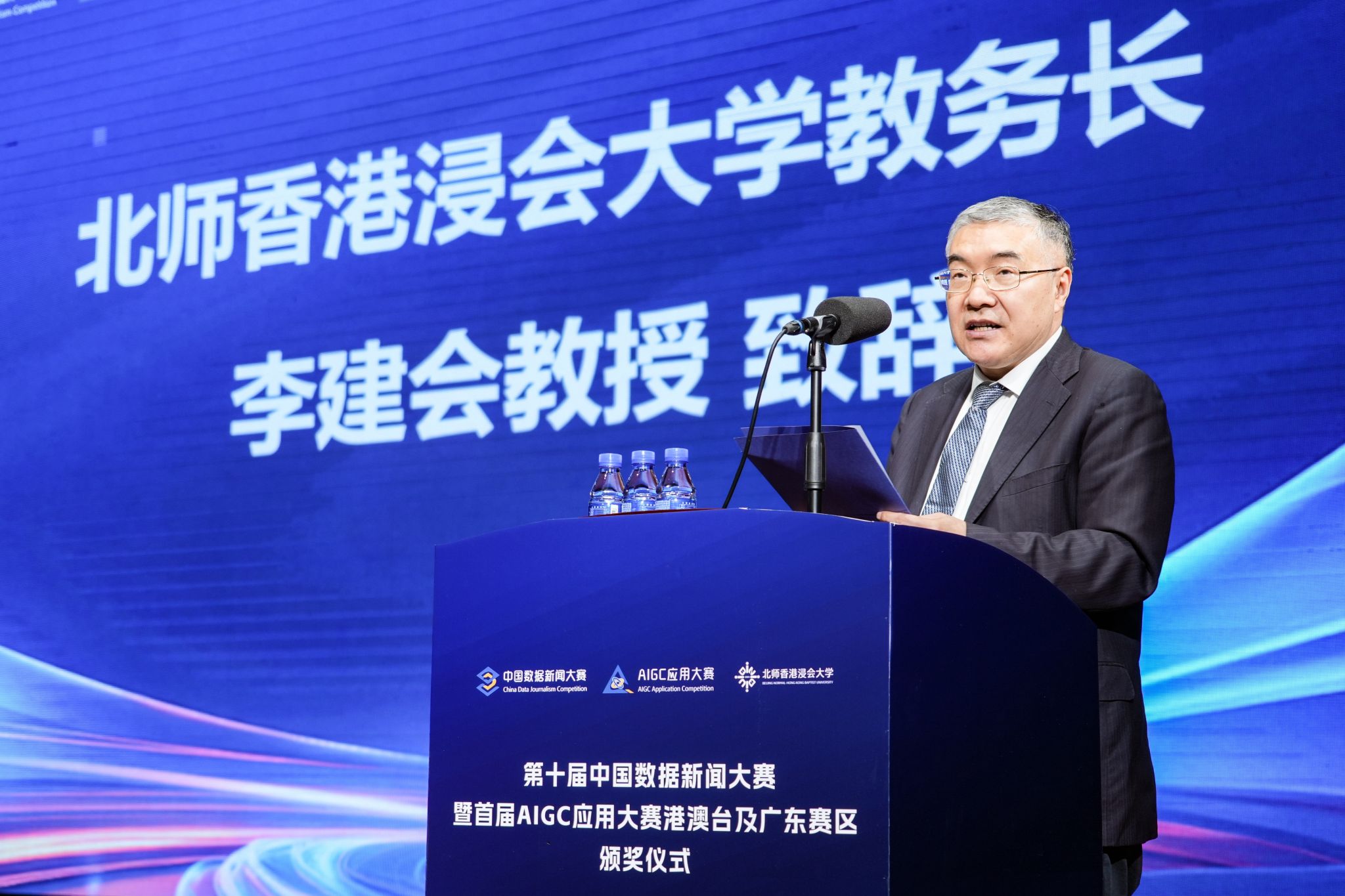 北师港浸大教务长李建会教授在颁奖典礼上表示,中国数据新闻大赛历经多年发展,已成为数据科学理性与新闻传播创意交汇融合的重要平台。而本届大赛,面对AI浪潮,创新增设了AIGC应用赛道,为同学们搭建一个技术赋能创作的新舞台。他鼓励大家把此次比赛的收获变成未来前行的动力,始终保持对未知的好奇,对创新的热情,在传媒与技术融合的道路上继续敢闯敢干,敢为人先。