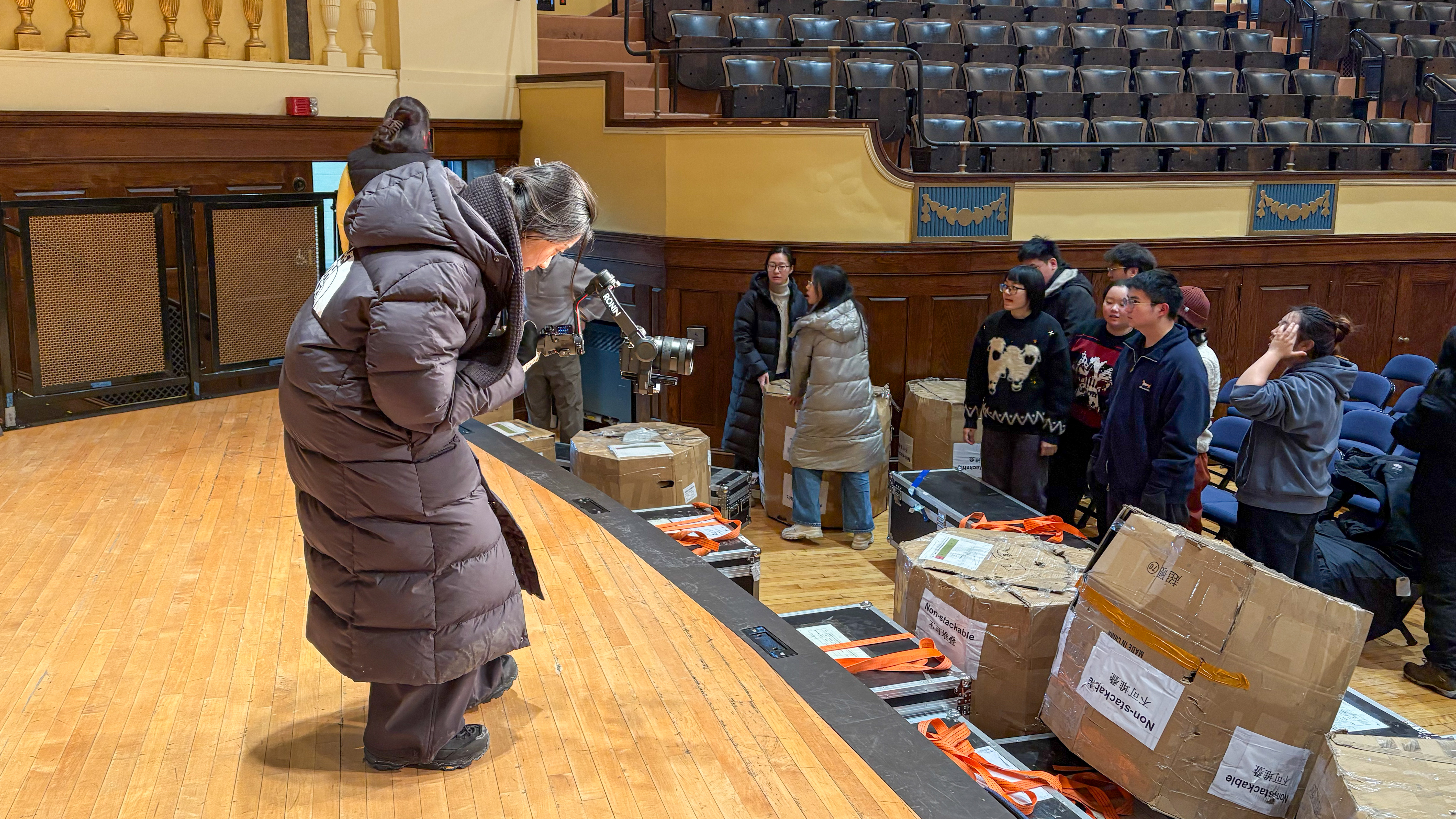 意外状况在异国他乡显得格外棘手。龙璇在安装乐器时发现重器底座有缺口,柯呈霖老师就地取材,用拉链封条进行加固,解决了问题;舞台灯光与国内差异巨大,波士顿站场地使用的是旧款插片调色灯,而非国内的电子编程灯控,为了保证舞台效果,周艳芮老师与剧院工作人员反复沟通调试,付出了很多努力。