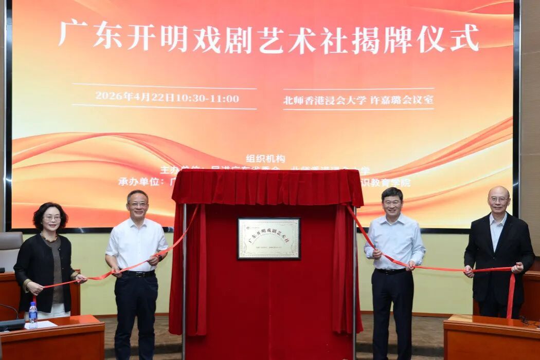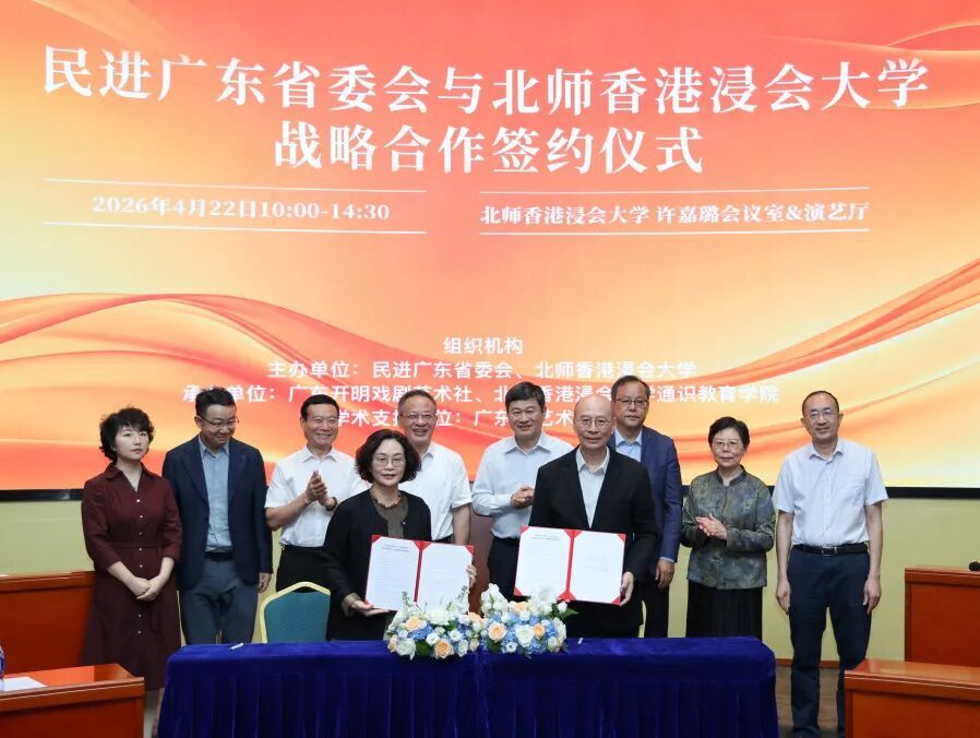 2026年4月22日,为助力粤港澳戏剧振兴发展,民进广东省委会与北师香港浸会大学(BNBU)正式签署战略合作框架协议,并共同成立“广东开明戏剧艺术社”。来自戏剧界、教育界的专业人士,以及民进广东省委会等单位的嘉宾齐聚北师港浸大,共探粤港澳大湾区青年戏剧教育协同机制。