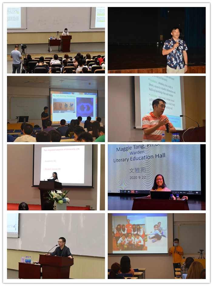 八大苑舍舍监:博雅苑舍监马杰芳博士、寰雅苑舍监汤绍龙博士、智雅苑舍监彭小令博士、文雅苑舍监邓美结博士、卓雅苑舍监黄匡忠教授、科雅苑舍监吴京津博士、创雅苑副舍监巴常之、德雅苑舍监谭达强也分别为新生们带来了精彩的分享,针对学习及生活的各方面解疑答惑。