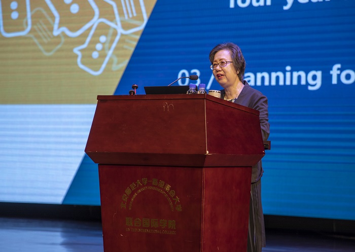 9月26日上午,协理副校长左龙佩兰教授带来主题为《University Life at UIC-Challenges and Success》的演讲。左教授从“UIC教育的独特性、大学四年学习中将面临的挑战、如何在UIC取得成功”三个方面,引导新生从学习及生活各方面去做好个人规划,更好地适应UIC的博雅教育。左教授寄语新生:“接下来的四年里,希望你们成为擅长独立学习的大学生,学会时间规划,提高英语能力,培养学习兴趣,并致力于成为兼具领导力、专业知识技能、创造力、正直诚信的‘全人’。”