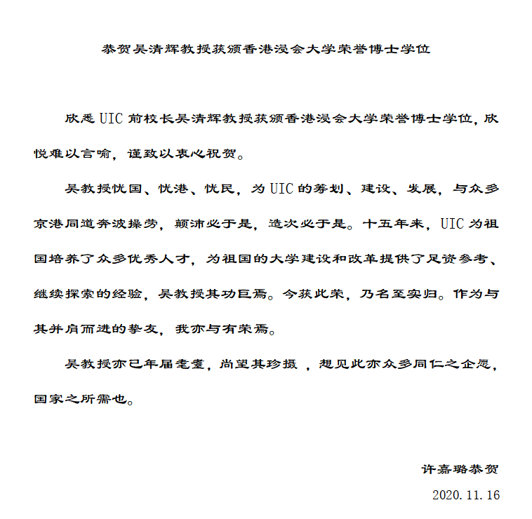 校董会主席许嘉璐教授向吴清辉教授发来贺信