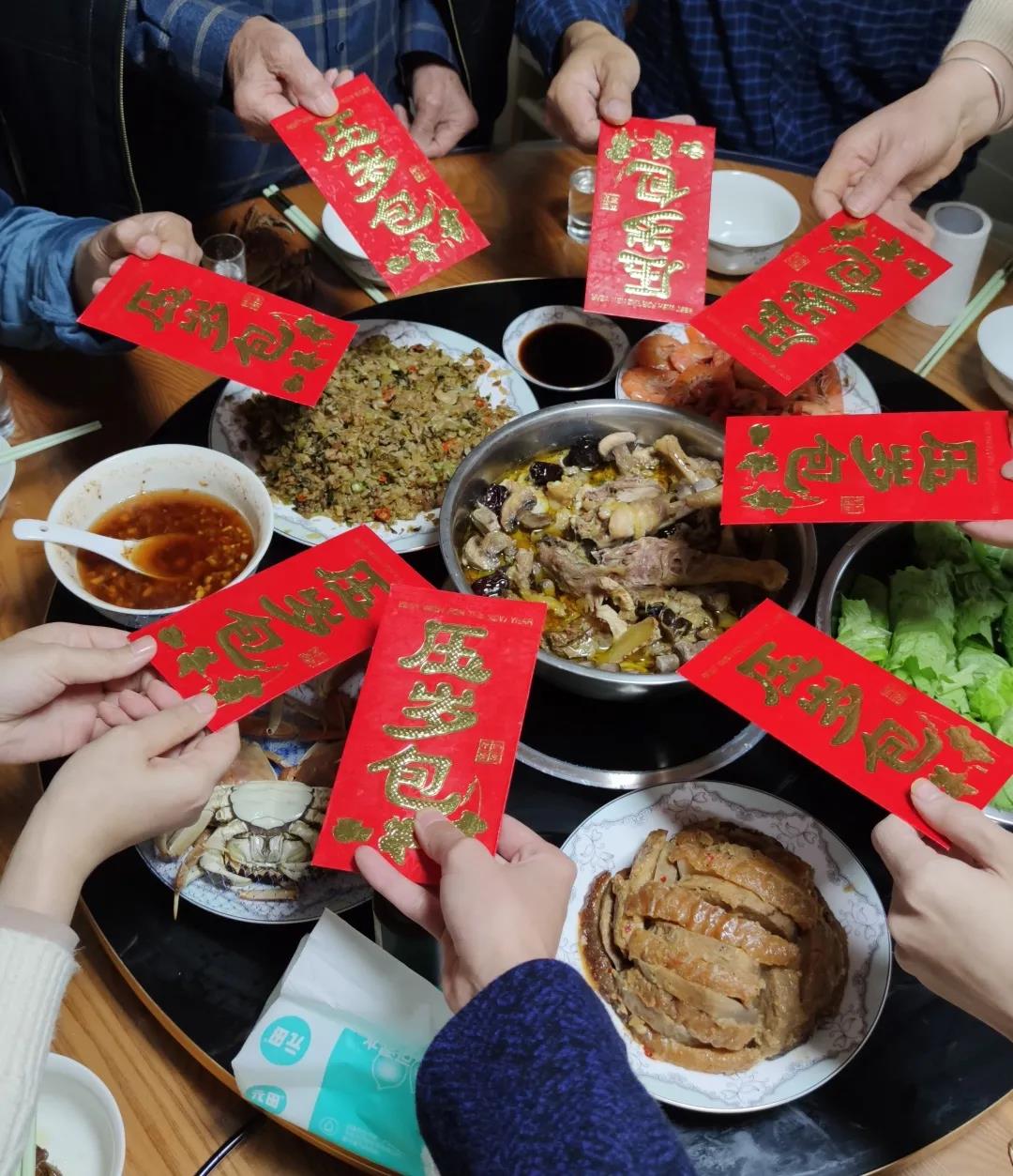 大年三十的年夜饭,家中老小聚满了一桌。爷爷在开饭前给桌上每个人都发了一个大红包。鸡汤、盐菜、扣肉、海鲜、辣椒酱和火红的红包一起,让牛年的开端倍感温暖。