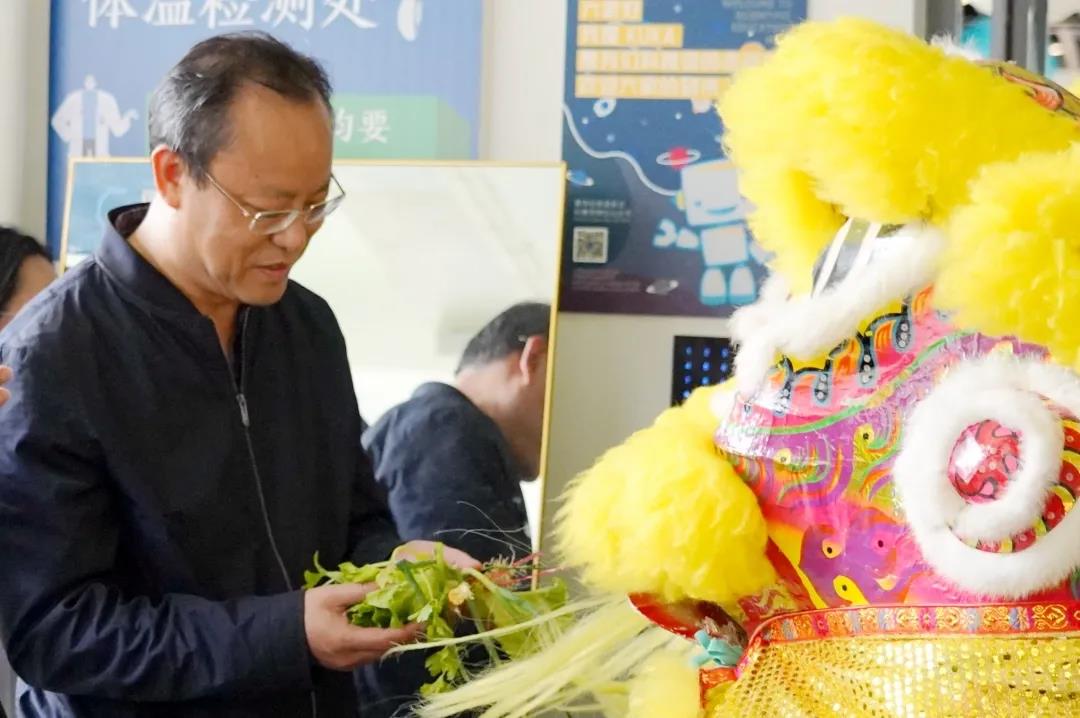 毛亚庆教授从祥狮口中接过生菜,表示接到了“福气”