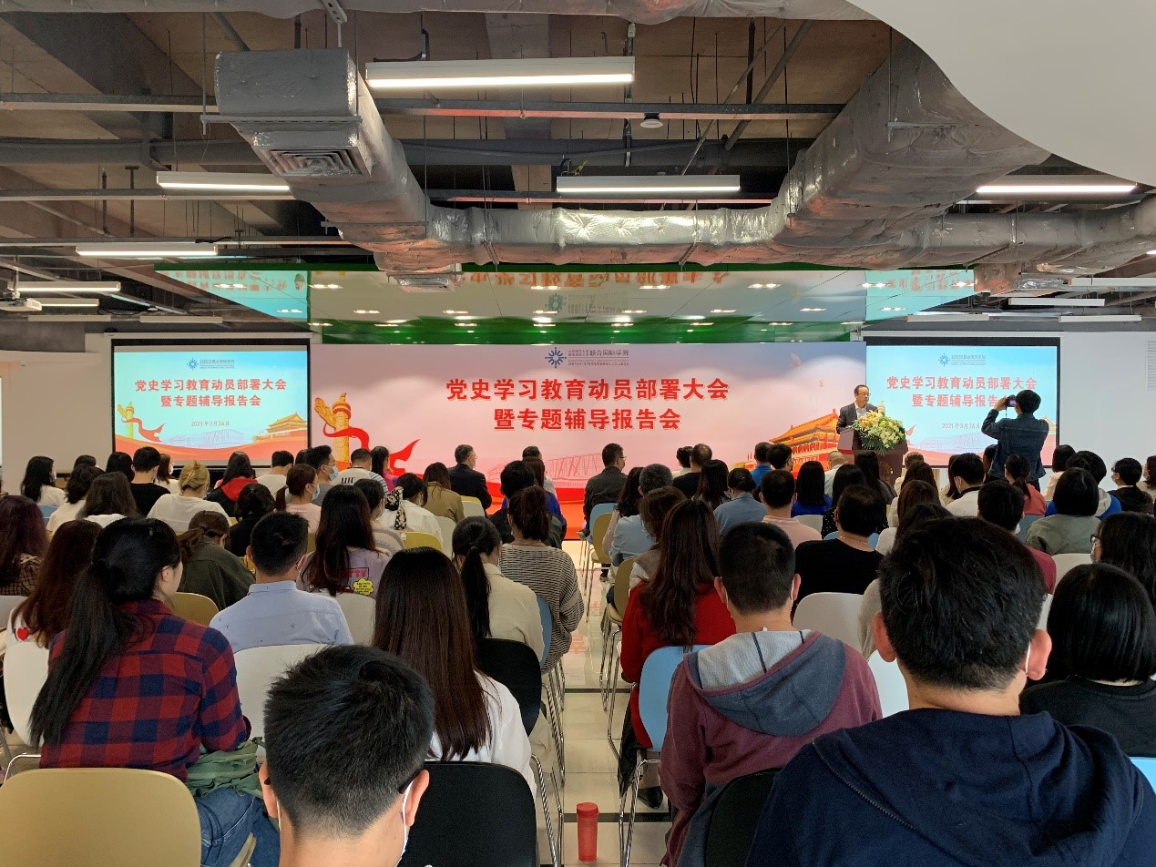 2021年3月26日下午,北师港浸大(UIC)校党委于师生活动中心召开党史学习教育工作动员部署大会暨专题辅导报告会。学校党委书记、副校长毛亚庆教授出席会议,中共珠海市委党校、市委宣讲团成员杜满昌教授受邀作专题辅导报告,160余名师生党员、入党积极分子参加会议。会议由党委副书记王红同志主持。