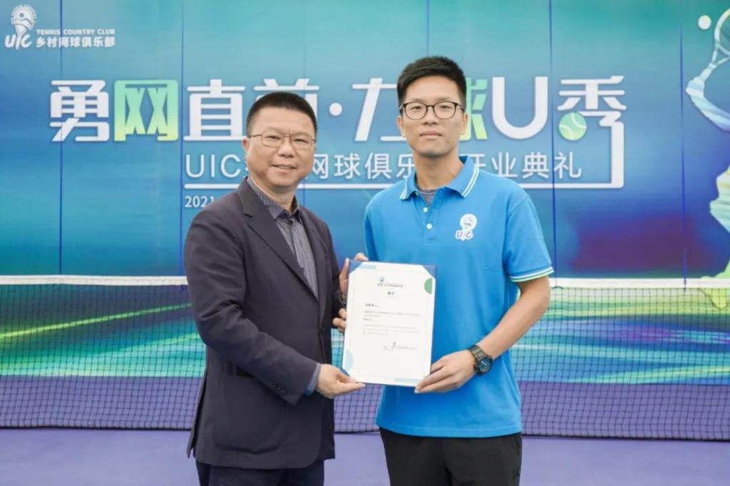 UIC乡村网球俱乐部特聘UIC网球教师唐德锐为俱乐部主任,许清彬董事长(左)为唐德锐颁授任命书