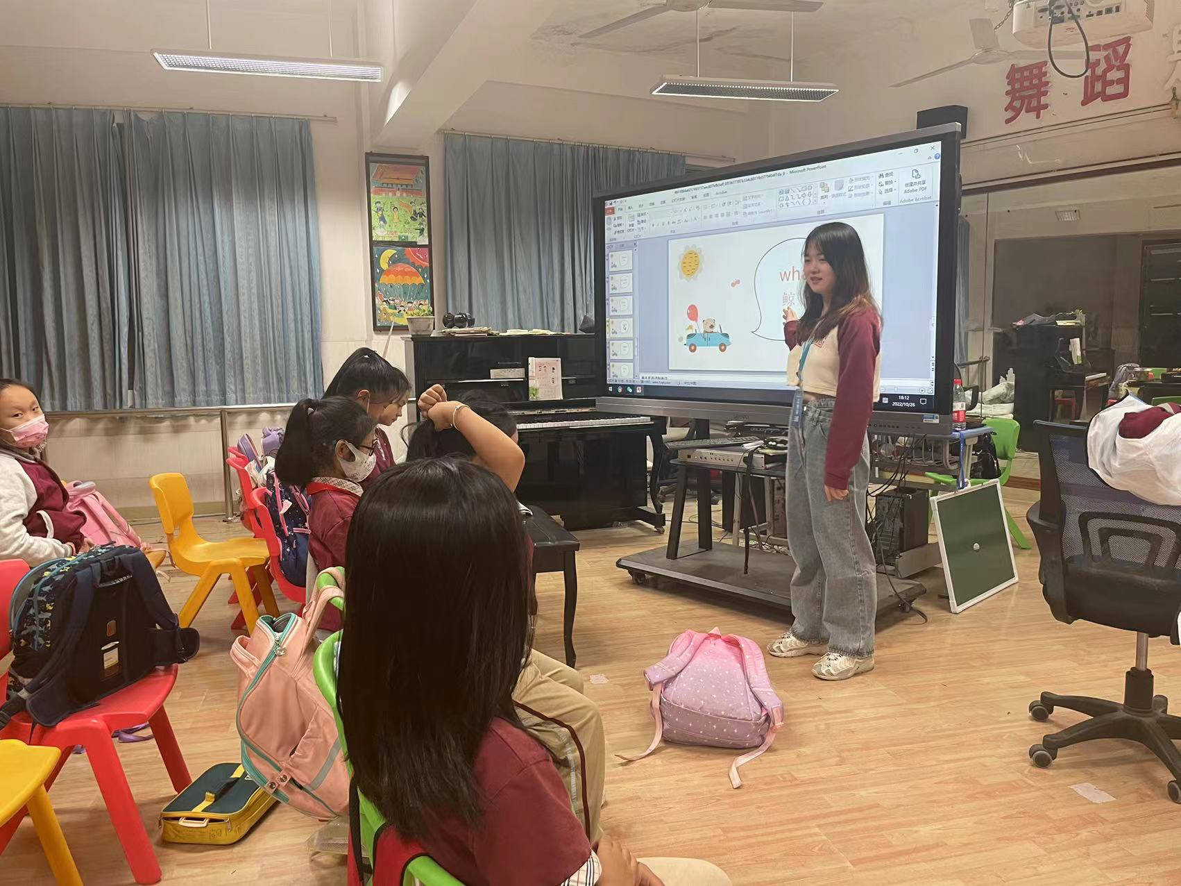 叶平在珠海市香洲区广生小学进行专业实习,教小朋友们戏剧表演。在UIC接受了两年多的英语专业学习后,她希望能将课堂上学到的知识运用到实际工作中。