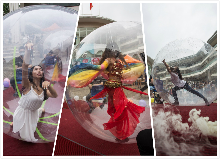一场出其不意的行为艺术表演在UIC的F区广场举行。广场中央放置三个透明气球,舞者置身其中,他们通过肢体语言表达对于绿色的渴望。