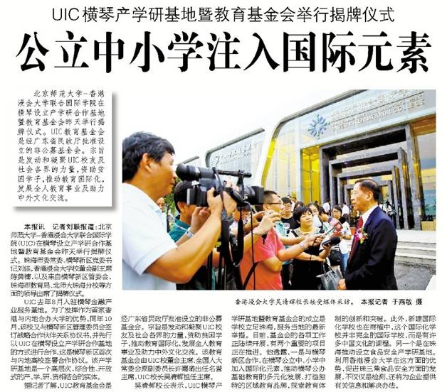 吴清辉校长表示,UIC横琴产学研基地暨教育基金会的成立是学校立足珠海,服务当地的最新举措。目前,基金会的各项工作正陆续开展,有两个重要的项目正在推进。他透露,一是与横琴新区合作,在横琴公立中、小学中加入国际化元素,推动横琴公办基础教育的多元化发展,打造独特的区域教育品牌,探索教育体制的创新和突破。此外,新建国际化学校也在商榷中,这个国际化学校并非完全的国际学校,而是有许多中国文化的课程。另一个是在珠海推动设立食品安全产学研基地。利用香港浸会大学在这方面的优势,促进珠三角食品安全方面的发展,不仅仅是检测,还将为企业提供有关信息和解决办法。