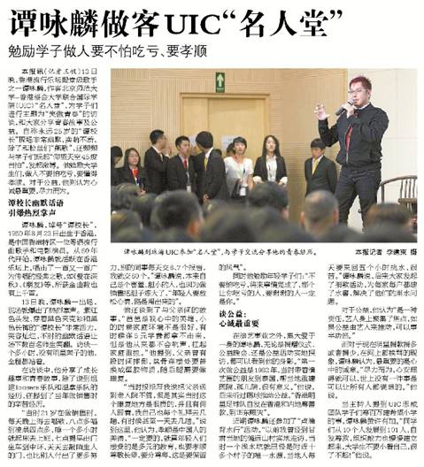 本报讯(记者王帆)13日晚,香港流行乐坛殿堂级歌手之一谭咏麟,作客北京师范大学-香港浸会大学联合国际学院(UIC)“名人堂”,为学子们进行主题为“笑傲青春”的访谈,和大家分享青春故事及公益。自称永远25岁的“谭校长”现场非常幽默,卖萌不断,除了和粉丝们“飙歌”,还频频与学子们玩起“仰望天空45度自拍”,发起微博。他勉励大学生们,做人不要怕吃亏,要懂得孝顺。对于公益,他则认为心诚最重要,尽力而为。