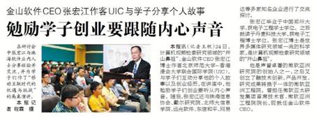 本报讯(记者王帆)24日,计算机视频检索研究领域的“开山鼻祖”、金山软件CEO张宏江博士作客北京师范大学-香港浸会大学联合国际学院(UIC),与学子们互动分享他的个人故事以及创业经历,在讲座中,他勉励学子们创业要听从内心声音。随后,张宏江还与珠海信息协会、戴尔研究院、北师大信息学院、远光软件、东信和平、网易达等多家知名企业进行了交流探讨。
