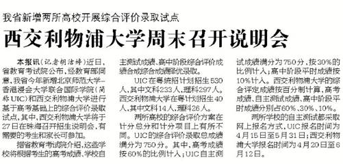 本报讯(记者胡洁婷)近日,省教育考试院公布,经教育部同意,我省今年新增北京师范大学-香港浸会大学联合国际学院(简称UIC)和西交利物浦大学进行基于高考基础上的综合评价录取试点,其中,西交利物浦大学将于27日在珠海召开招生说明会,有需要的考生和家长可参加。