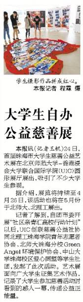 本报讯(记者王帆)24日,首届珠海市大学生慈善公益艺术展在北京师范大学-香港浸会大学联合国际学院(UIC)圆形展厅展出,吸引了不少大学生参观。