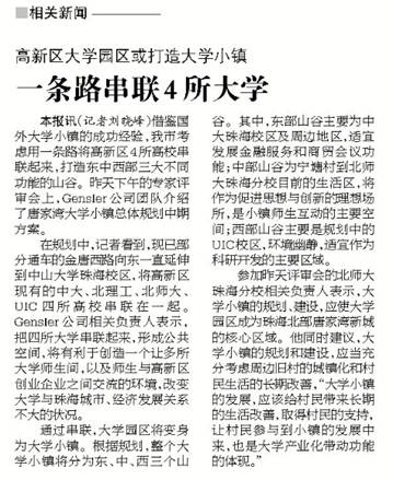 参加昨天评审会的北师大珠海分校相关负责人表示,大学小镇的规划、建设,应使大学园区成为珠海北部唐家湾新城的核心区域。他同时建议,大学小镇的规划和建设,应当充分考虑周边旧村的城镇化和村民生活的长期改善,“大学小镇的发展,应该给村民带来长期的生活改善,取得村民的支持,让村民参与到小镇的发展中来,也是大学产业化带动功能的体现。”