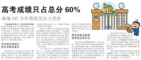 该校负责人介绍,2012年初以来,教育部门希望UIC能在招生考试制度上有所突破,到今年4月上旬,教育部正式批复广东省教育厅,同意UIC 2013年在广东省进行招生试点工作,实施高考基础上的综合评价录取。