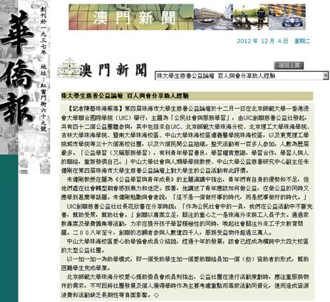 【记者陈艺珠海报导】第四届珠海市大学生慈善公益论坛于十二月一日在北京师范大学—香港浸会大学联合国际学院(UIC)举行,主题为「公民社会与服务学习」,由UIC创联慈善公益社发起,共有四十二个公益团体参与,其中包括来自UIC、北京师范大学珠海分校、北京理工大学珠海学院、吉林大学珠海学院、暨南大学珠海校区、中山大学珠海校区、遵义医学院珠海校区,以及东莞理工学院城市学院等三十六个高校社团,以及六个民间公益组织。整天活动有一百多人参加,人数为历届最多。「公益学习(又称服务学习),有利青年学习善良,学习权责意识,学习合作,学习人与人的联络,重新发现自己。」中山大学社会与人类学学院教授、中山大学公益慈善研究中心副主任朱健刚在第四届珠海市大学生慈善公益论坛上对大学生的公益活动有此评价。