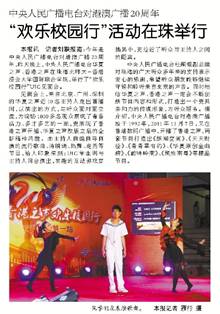 本报讯 记者刘联报道:今年是中央人民广播电台对港澳广播20周年,昨天晚上,中央人民广播电台华夏之声、香港之声在珠海北师大-香港浸会大学国际联合学院,举行了“欢乐校园行”UIC见面会。